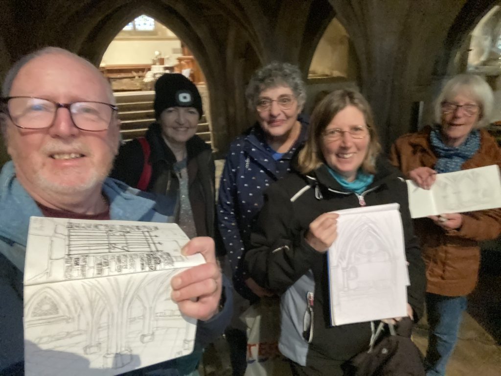Seven of us gathered for a sociable coffee and toasted tea cakes, prior to setting out into the damp day, sketching the beautiful buildings of Wimborne Minster. No was no coaching on offer today – just the opportunity to gather and sketch for free. Having gone off in our own directions to sketch the shops, offices and pubs – we reconvened for a light lunch and some ‘colouring in’ whist the rain tipped it down outside. We did venture out again, and enjoyed exploring and sketching the imposing Minster, itself. The grand 12th century Norman arches, the below-ground-level Crypt with it’s amazing vaulted ceiling, a Knights tomb and the smaller architectural details, too. But before we knew it, it was time to say farewell… Thank you sketchers – a great day!